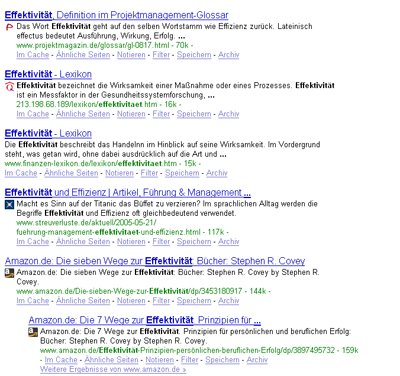Versuchen wir uns an dem Beispiel was gut zu unserem Blog passt „Effektivität“ suchen wir nach diesem Begriff bei Google erhalten wir zum größten Teil nur Werbung.