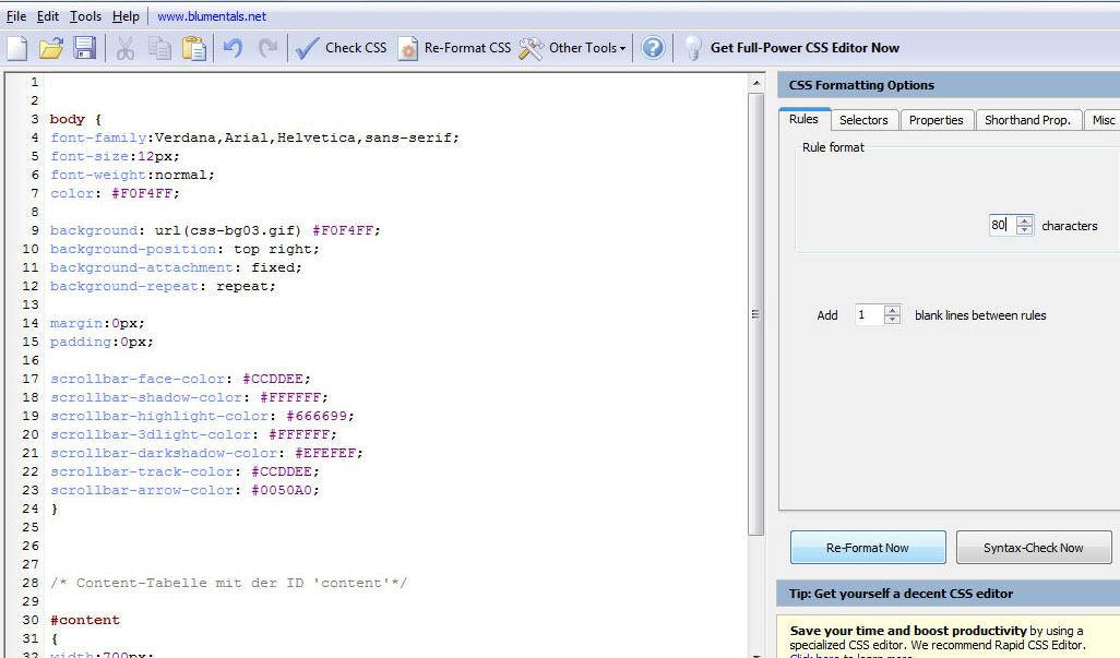 lange war ich auf der Suche nach einem handlichen und kostenlos Tool für meine CSS Files, dieses habe ich nun gefunden : FREE CSS Toolbox.