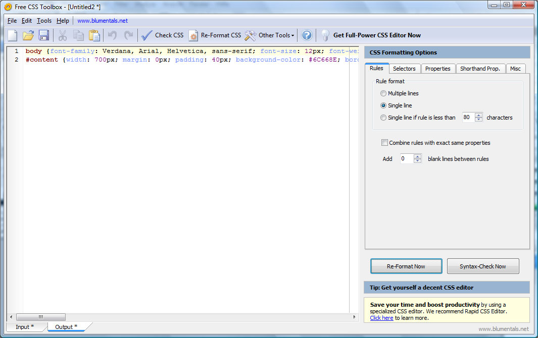 Was genau mich nun wirklich begeistert hat, ist das komprimieren und formatieren des CSS Codes in alle „Richtungen“ , wer zum Beispiel gerne sein Styles über viele Zeilen verteilt beim Entwicklen, drückt 1 – 2 Buttons und hat wunderbar alles in einer Zeile. Schön ist vorallem das sich dieses auch genauso schnell wieder rückgängig machen lässt.