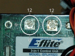 - Rechts: Proportional – Regelt die Geschwindigkeit der beiden Rotoren im Verhältnis zueinander. Ziel der Einstellung ist es, beide Rotoren mit der gleichen Geschwindigkeit drehen und damit der Helikopter ruhig steht. Auch hier ist 03:00 Uhr ein guter Ausgangswert.