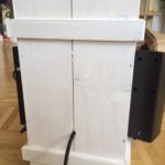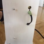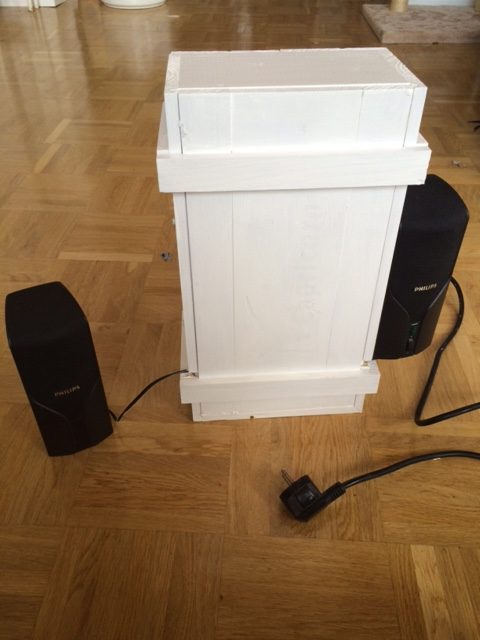 - Die Lautsprecher werden Links und Rechts an der Kiste befestigt. Wir haben und dafür entschieden, diese abnehmbar anzubringen. Dazu haben wir Schrauben an der Kiste angebracht und die Lautsprecher angebohrt. Hier ist es empfehlenswert, diese vor dem Bohren zu öffnen um zu prüfen, wo lebenswichtige Elemente im Inneren liegen.