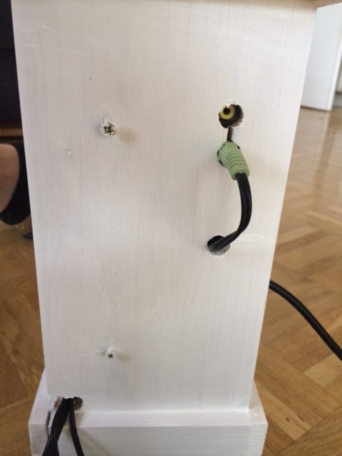 - Die Kabel der Lautsprecher werden, wiederum durch eine Bohrung, unterhalb der Lautsprecher, ins Innere geführt.